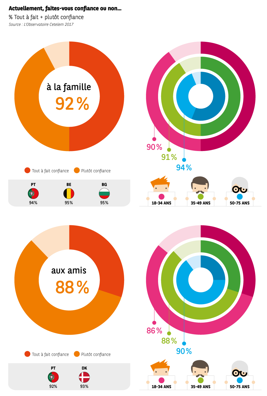 Plus que toute autre, la famille se présente comme un oasis de confiance. 92 % des Européens l’affirment avec des différences générationnelles qui ne comptent guère. Une famille qui est une valeur-référence, un refuge au sein duquel on se rassemble en ces temps difficiles, mais qui peut aussi susciter une certaine inquiétude, d’autant plus que ceux qui la composent vous sont chers.