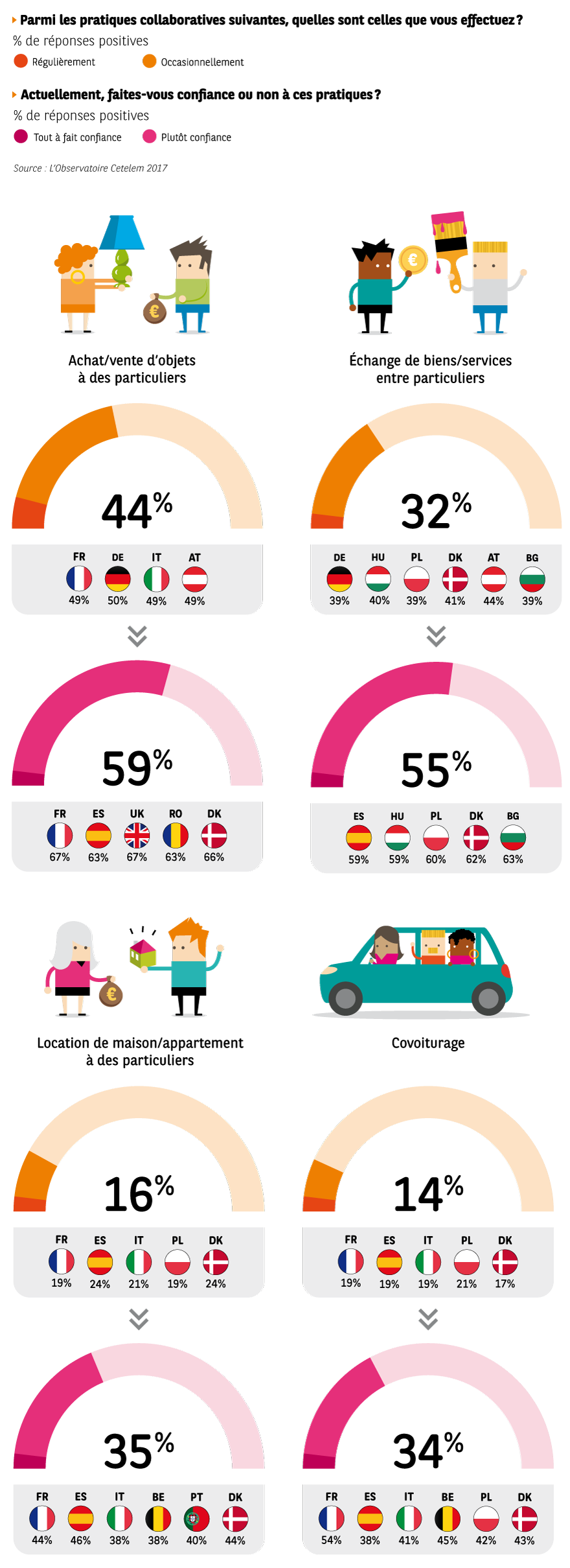 Les Européens interrogés par l’Observatoire Cetelem 2017 de la Consommation pratiquent avant tout l’achat et la vente d’objet entre particuliers (44 %) et dans une moindre mesure l’échange de biens et services (32 %), la location de maison et d’appartement (16 %) et le covoiturage (14 %). Mais surtout ils affichent une certaine confiance dans ces nouveaux modes de consommation qui valorisent les circuits courts. Ainsi, plus d’un Européen sur deux pratique en toute confiance l’achat, la vente ou l’échange de biens et services. Confiance, nous le verrons plus tard, dont peu d’institutions peuvent se prévaloir.