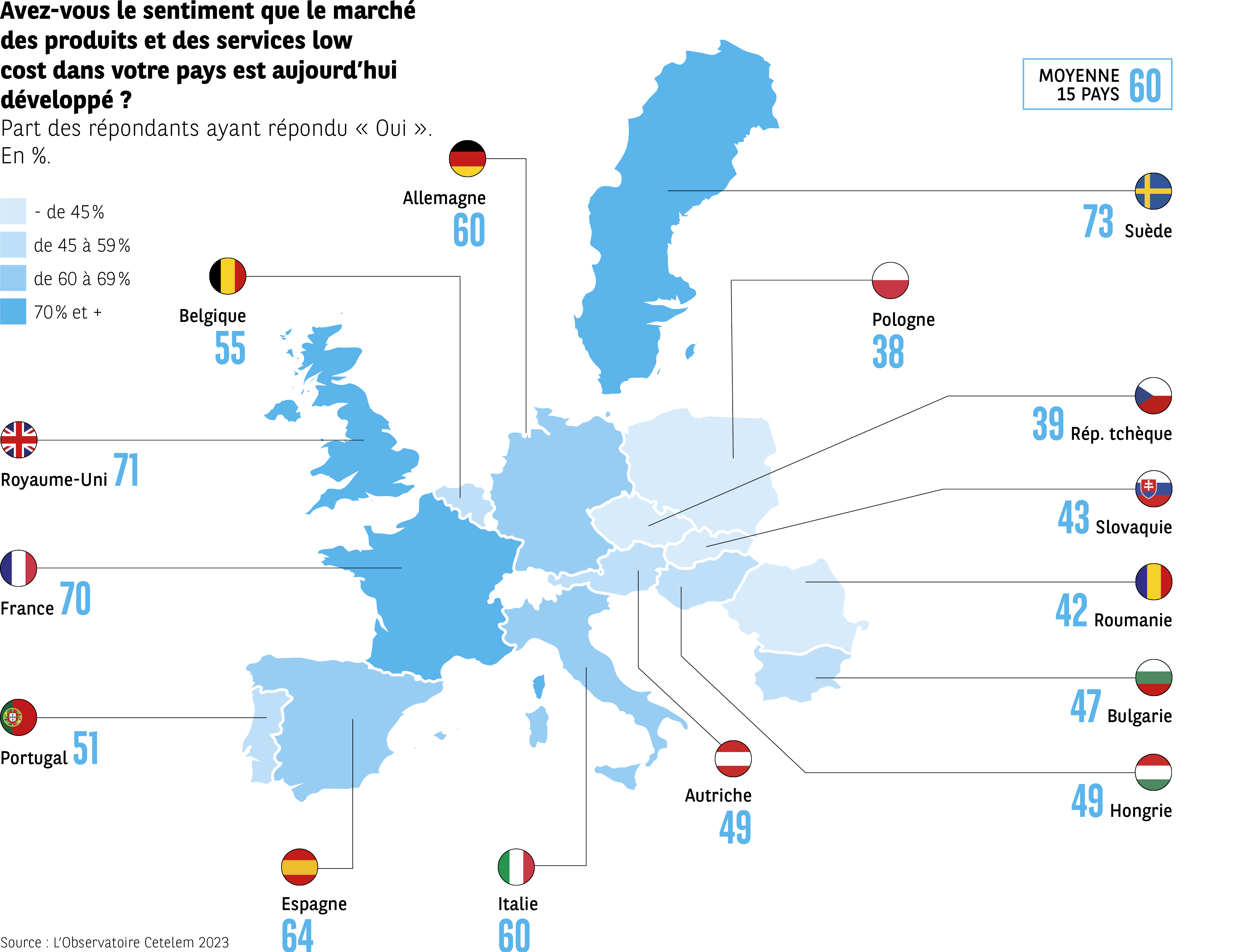 De façon quasiment symétrique, les Européens jugent également que le low cost est développé dans leur pays. 6 sur 10 l’affirment. Seulement 11 % vont jusqu’à penser que ce développement est très important ce qui laisse donc une marge de manœuvre conséquente au low cost pour accroître sa visibilité et par là même son poids économique. Au plan géographique, il faut cette fois gagner le Nord et l’Ouest de l’Europe pour trouver le plus grand nombre de consommateurs soulignant le développement du low cost (7 sur 10 en Suède, au Royaume-Uni et en France) (Fig. 3).