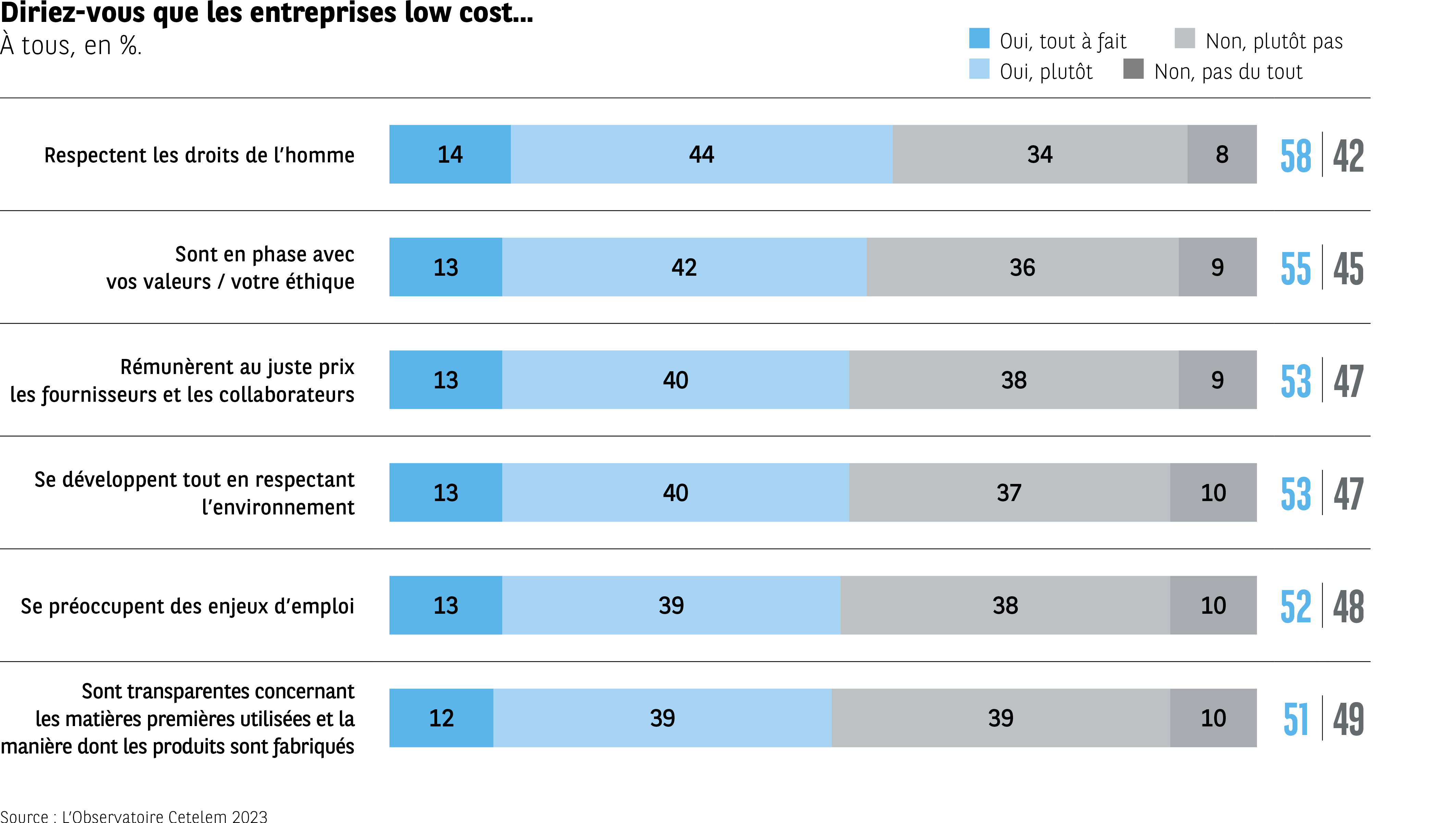 Cette impression d’un sentiment « mitigé », entre deux eaux, rencontre un certain écho lorsqu’on entre dans le détail des valeurs associées au low cost.