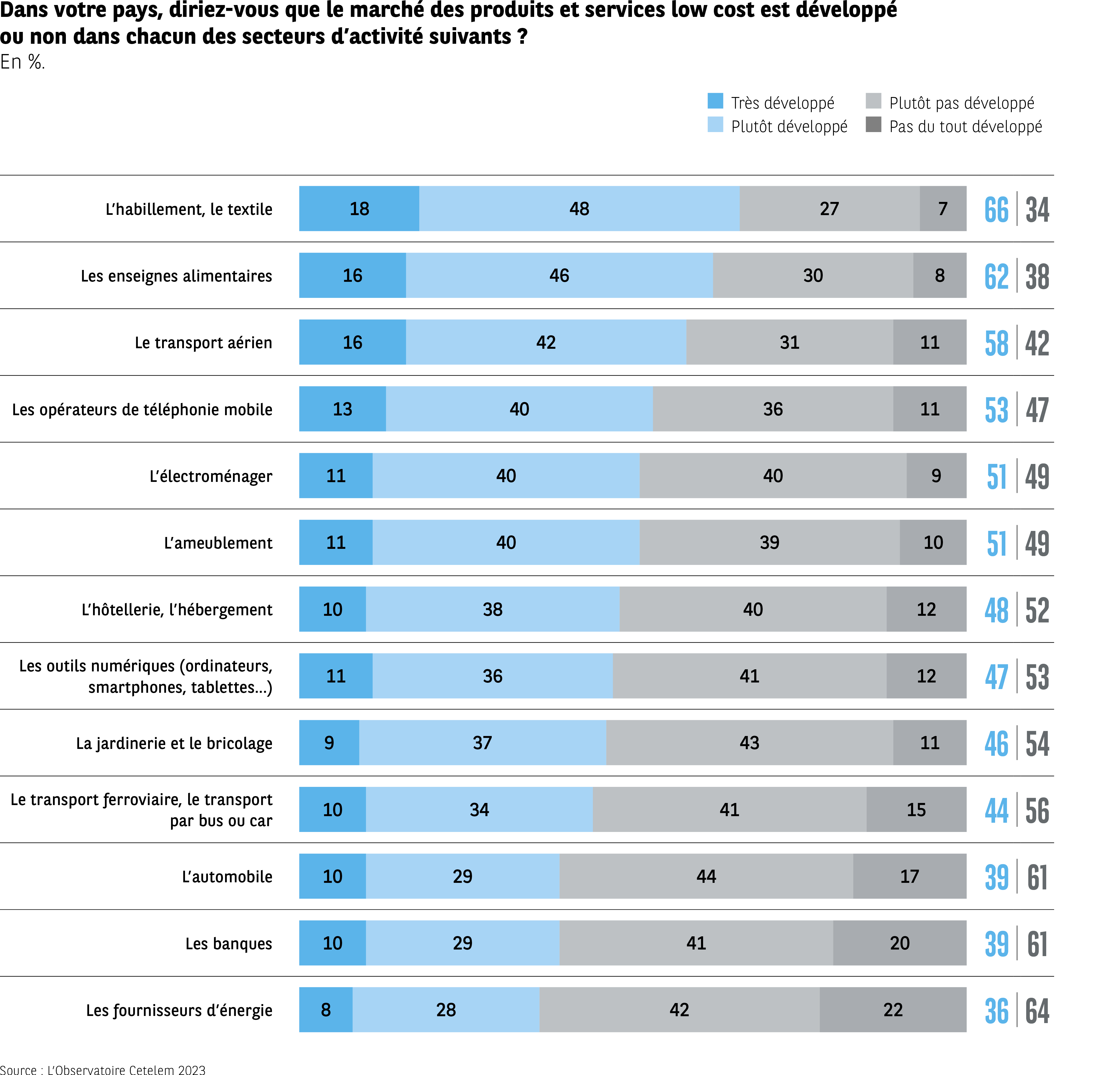 L’infographie présente, en pourcentage, le niveau de développement perçu du marché des produits et services low cost dans 13 secteurs. Les réponses sont réparties en « Très développé », « Plutôt développé », « Plutôt pas développé » et « Pas du tout développé ».