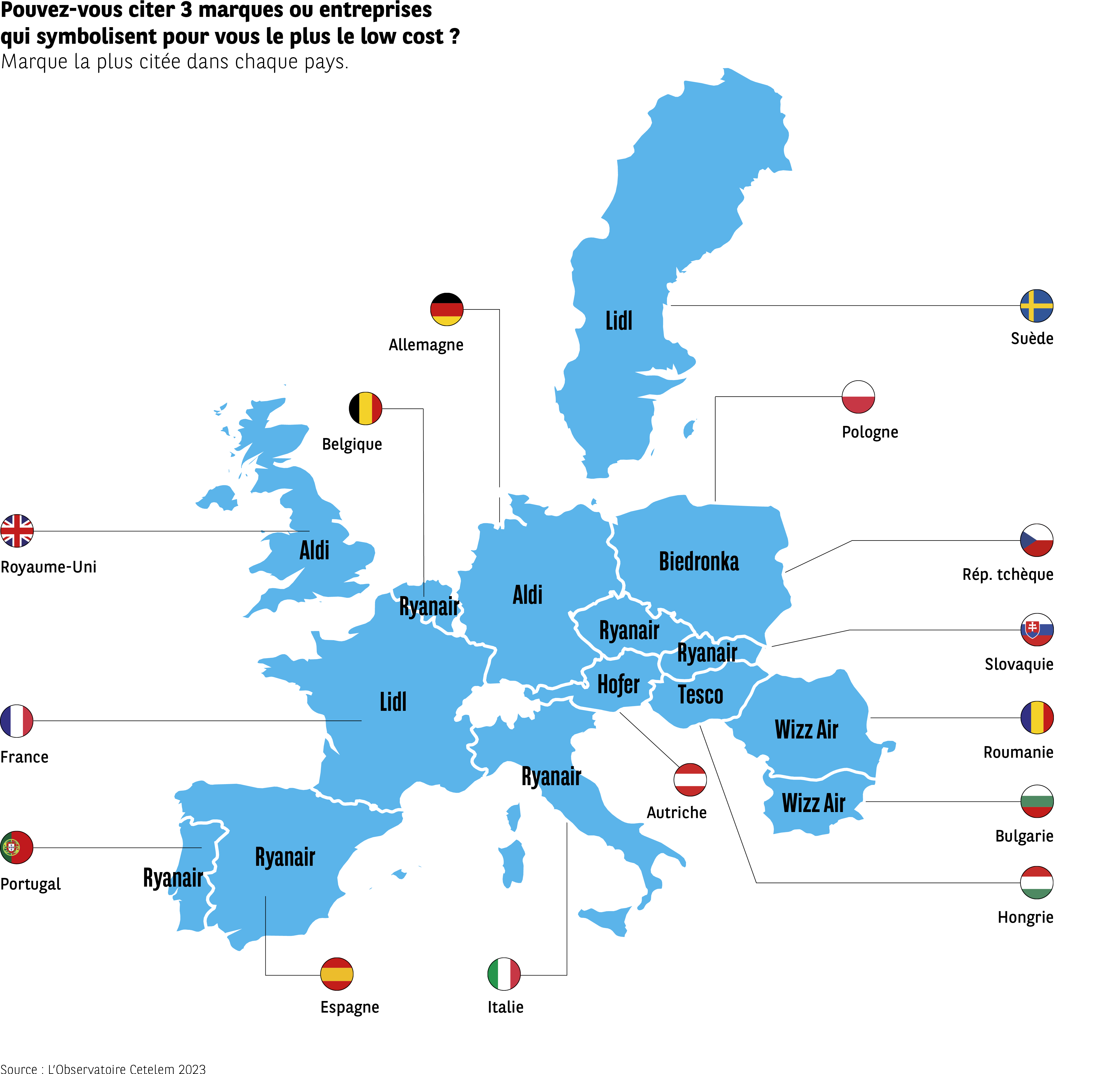 La distribution alimentaire (Lidl, Aldi) et le transport aérien (Ryanair, EasyJet) figurent parmi les marques les plus associées au low cost.
