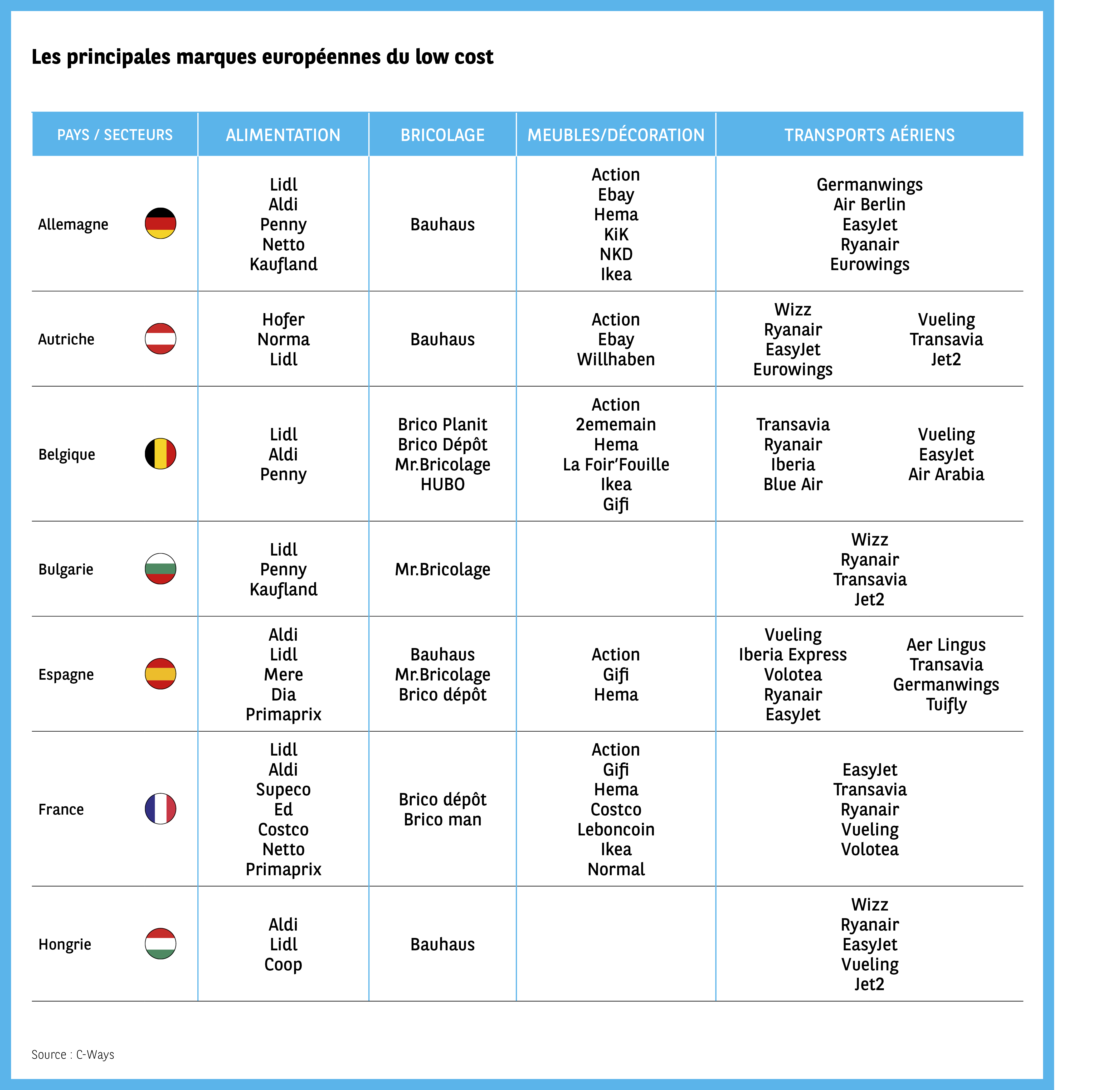 L’infographie présente un tableau répertoriant les principales marques low cost pour huit pays européens. Les secteurs couverts sont : alimentation, bricolage, meubles/décoration et transports aériens.