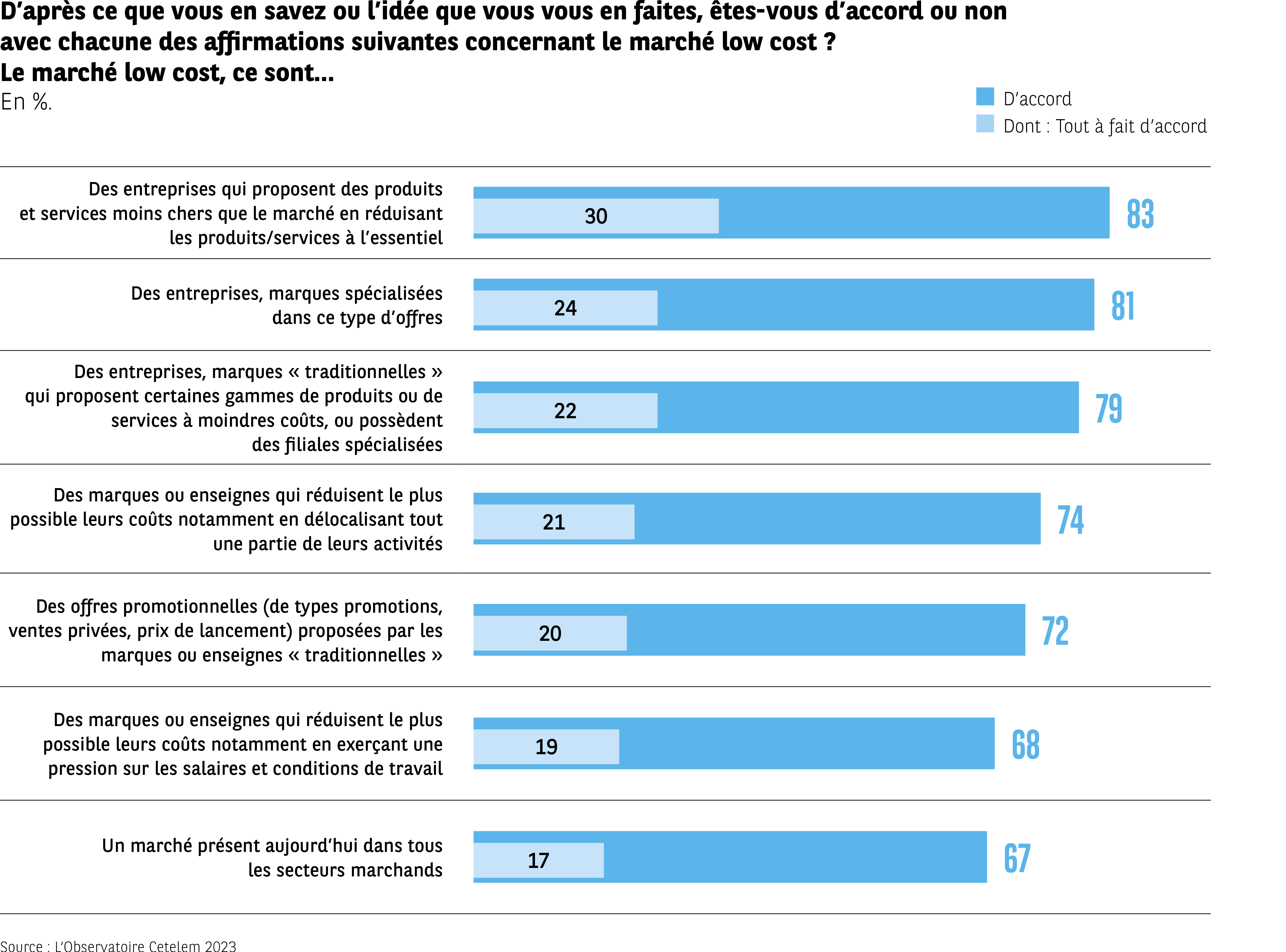 L’infographie présente la part de répondants « d’accord » avec plusieurs descriptions du marché low cost. Chaque item comporte le pourcentage total d’accord et la part « tout à fait d’accord ».
