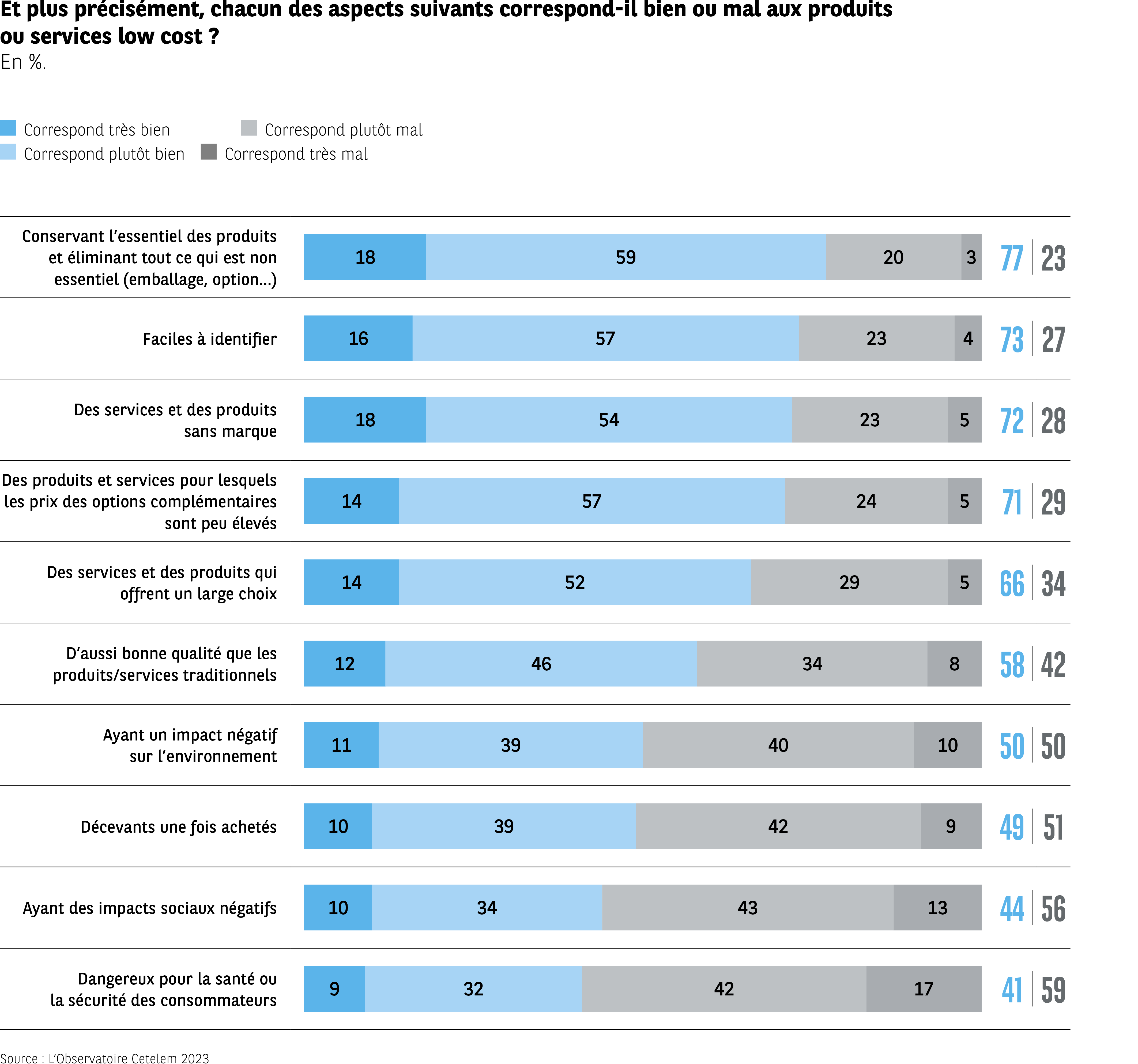 Les aspects liés à la simplicité et à l’absence de superflu sont perçus comme les mieux associés au low cost. Les dimensions négatives (impact social, santé, qualité) divisent davantage.