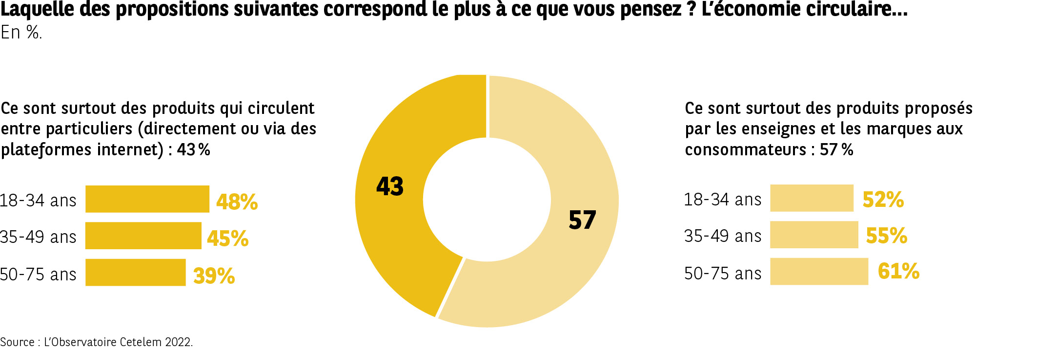 Compare deux visions de l’économie circulaire selon l’âge Contexte : Infographie présentant deux visions de l’économie circulaire et leur répartition. Éléments visuels : diagramme circulaire central et barres horizontales par âge. Données : • Produits circulant entre particuliers : 43 % – 18–34 ans : 48 % – 35–49 ans : 45 % – 50–75 ans : 39 % • Produits proposés par les enseignes/marques : 57 % – 18–34 ans : 52 % – 35–49 ans : 55 % – 50–75 ans : 61 % Enseignement principal : Les répondants associent davantage l’économie circulaire à l’offre des marques qu’aux échanges entre particuliers. Source : Observatoire Cetelem 2022.