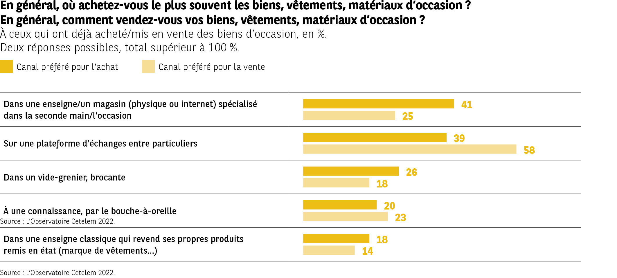 Montre canaux privilégiés pour acheter et vendre selon usage Contexte : Infographie comparant les canaux préférés pour acheter et vendre des biens d’occasion. Éléments visuels : barres jaunes pour achat et barres plus pâles pour vente. Données (achat / vente) : • Magasin spécialisé seconde main : 41 % / 25 % • Plateforme entre particuliers : 39 % / 58 % • Vide-grenier, brocante : 26 % / 18 % • Connaissance, bouche-à-oreille : 20 % / 23 % • Enseigne classique revendant ses produits remis en état : 18 % / 14 % Enseignement principal : Les achats se font surtout en magasins spécialisés, tandis que la vente passe majoritairement par des plateformes C2C. Source : Observatoire Cetelem 2022.
