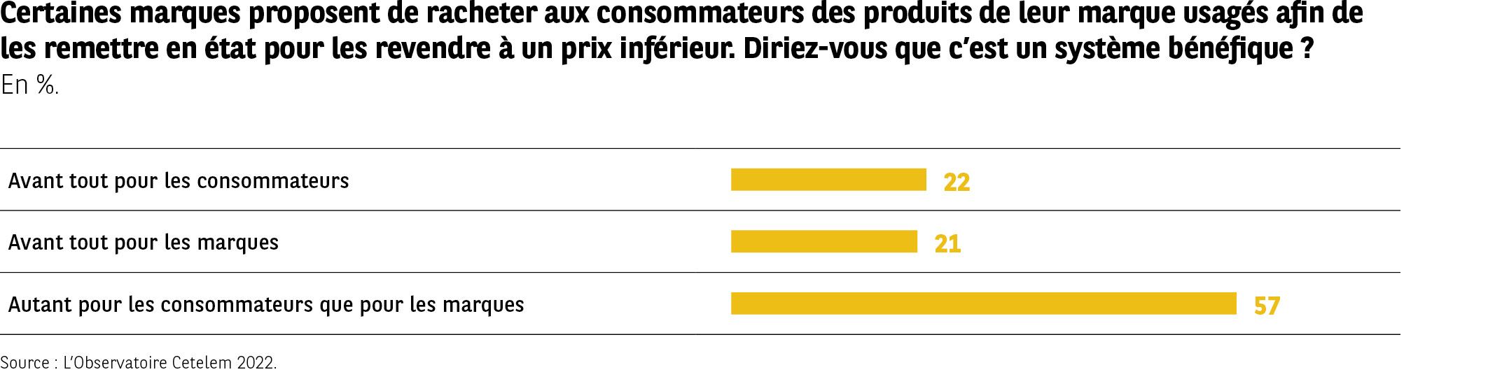Indique la perception de la valeur du rachat d’articles usagés Contexte : Infographie évaluant pour qui un système de rachat d’articles usagés profite le plus. Éléments visuels : trois barres horizontales. Données : • Bénéfique avant tout pour les consommateurs : 22 % • Bénéfique avant tout pour les marques : 21 % • Bénéfice équivalent consommateurs / marques : 57 % Enseignement principal : La majorité estime que le bénéfice est partagé entre marques et consommateurs. Source : Observatoire Cetelem 2022.