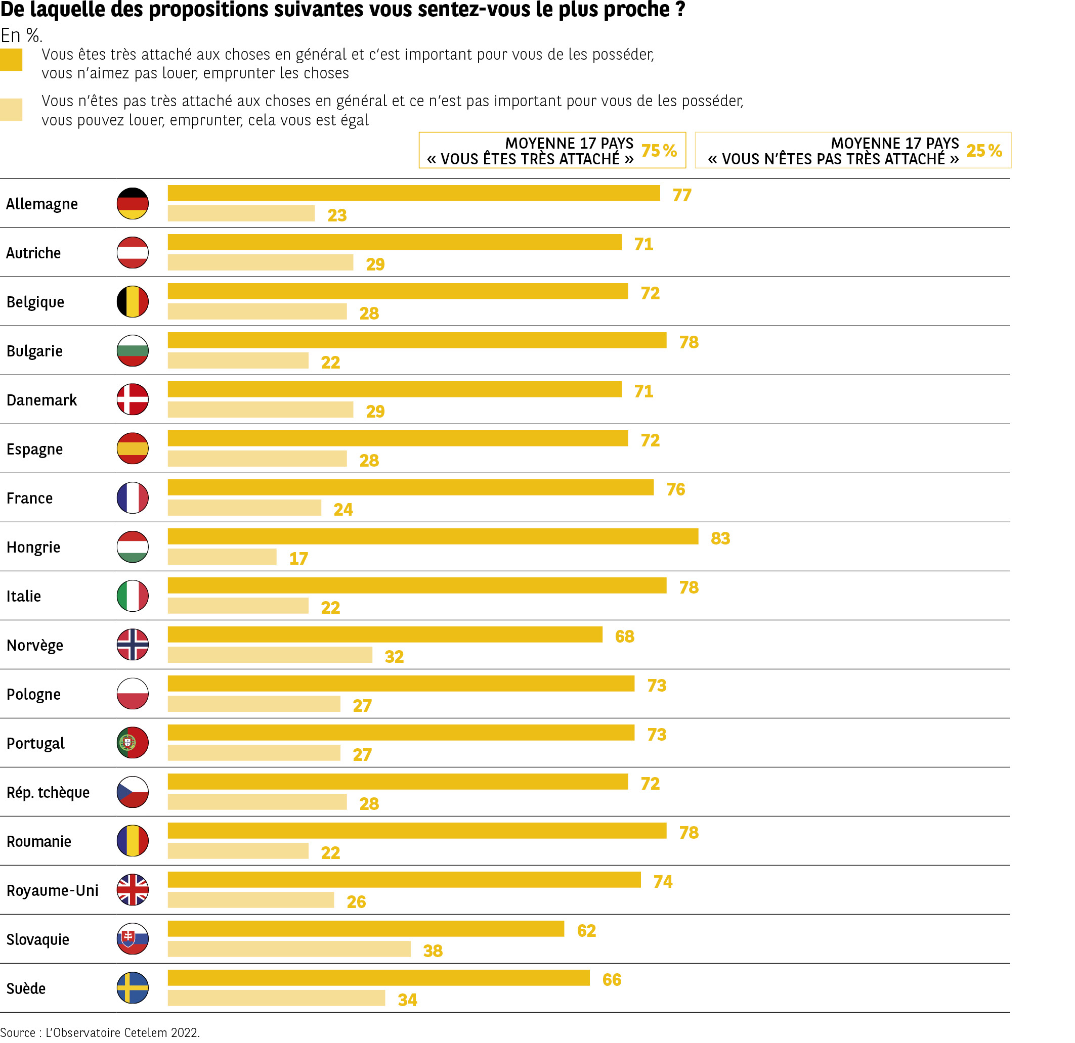 Analyser ces atouts invite à revenir aux fondements même du commerce. Alors que l’économie circulaire valorise l’occasion et le recyclage, la propriété a cependant de beaux jours devant elle. 3 Européens sur 4 se déclarent ainsi très attachés à posséder des biens (Fig. 21). Une position une fois encore générationnelle, les aînés revendiquant plus la possession que les jeunes générations. Davantage que les Suédois et Norvégiens, les Slovaques se montrent les plus distanciés par rapport à la propriété, tandis que les Hongrois, les Bulgares, les Italiens et les Roumains s’en réclament le plus.