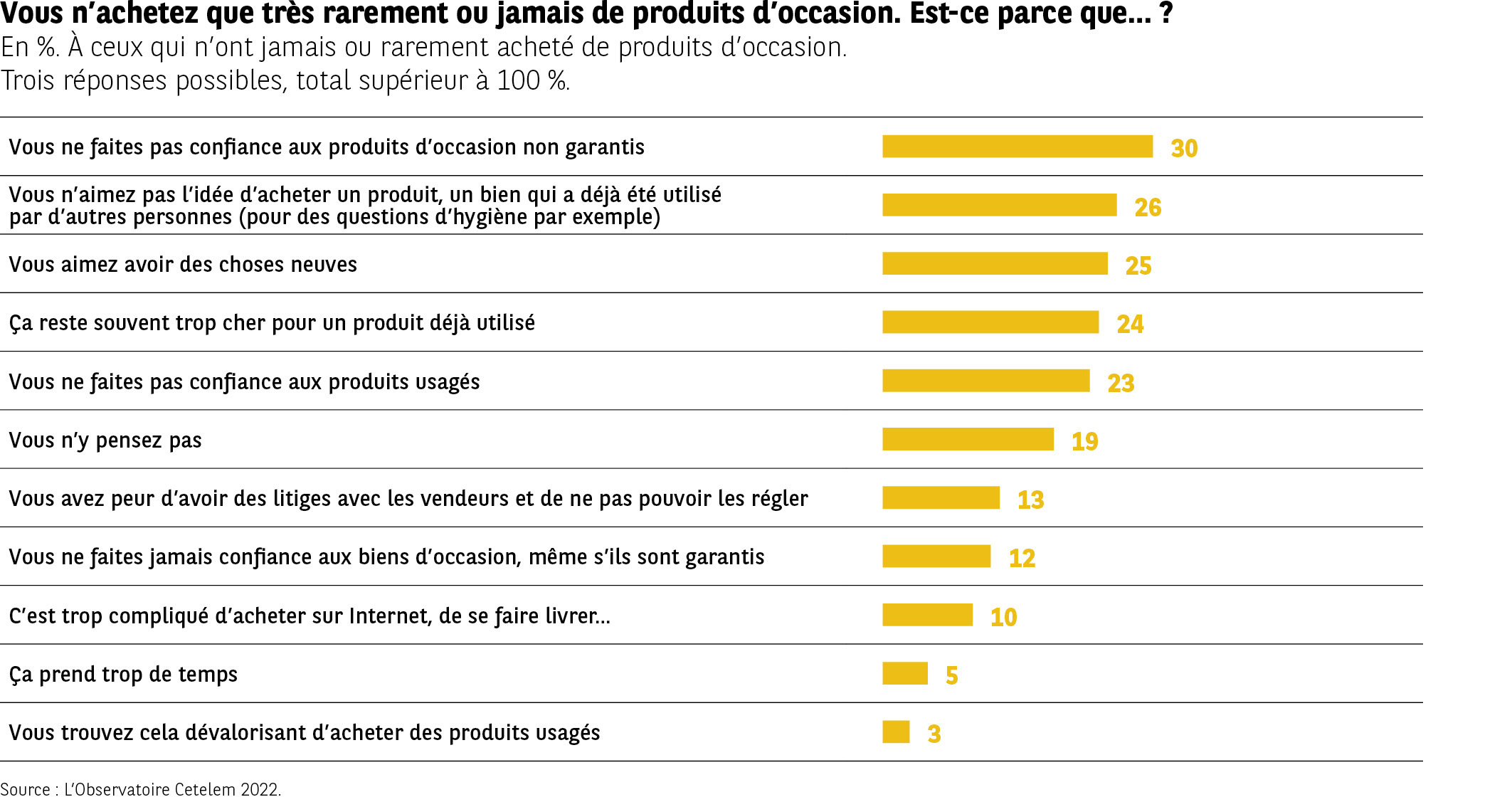 manque de confiance sans garantie (30 %), réticence à utiliser un objet déjà utilisé (26 %), préférence pour le neuf (25 %),