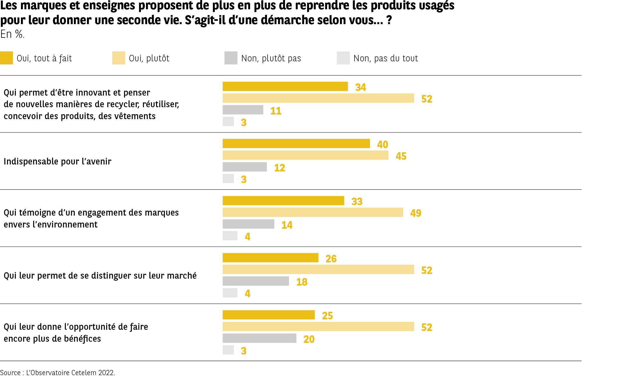 Et de fait, voir les marques et les enseignes investir le marché de la seconde main, reprendre les produits vendus pour leur donner une seconde vie, est perçu de façon très positive par les consommateurs. En premier lieu, 86 % estiment que c’est pour elles l’opportunité de démontrer leur sens de l’innovation. Toutes les nations de cette étude s’accordent à le dire avec, une fois encore, le duo lusitano-italien pour l’exprimer le plus haut et le plus fort.