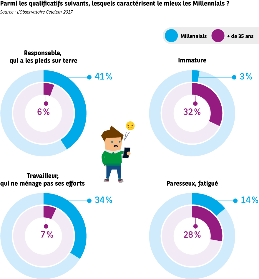 92 % des qualificatifs qu’ils choisissent pour se décrire sont positifs. Avant tout, ils se considèrent responsables. 41 % des Millennials européens partagent cette opinion contre seulement 6 % des + de 35 ans. Portugais, Bulgares et Espagnols sont les plus nombreux à le croire (respectivement 58 %, 49 % et 48 %), Polonais, Norvégiens et Slovaques étant plus circonspects (29 %, 34 % et 35 %).