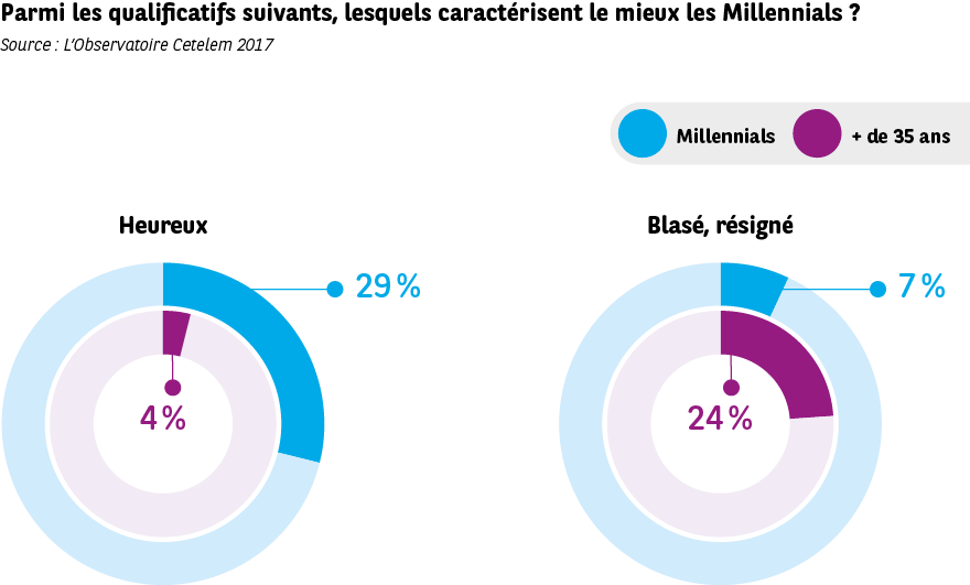 Les Millennials se considèrent aussi heureux ; 29 % l’affirment. À ce sujet, peu de différences notables, les opinions étant très proches d’un pays à l’autre. Cependant, si les Danois (39 %) se montrent encore plus satisfaits de leur sort que la moyenne, les Italiens se disent moins épanouis (16 %).
