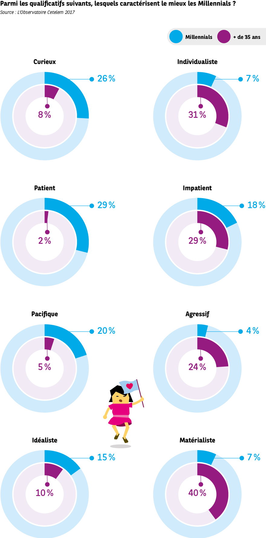 Toujours en opposition avec les + de 35 ans, les Millennials se jugent ensuite patients (29 % vs 2 %), curieux (26 % vs 8 %) et pacifiques (20 % vs 5 %). Les pays latins, Portugal, Italie et France, ainsi que la Belgique se distinguent à ce sujet.