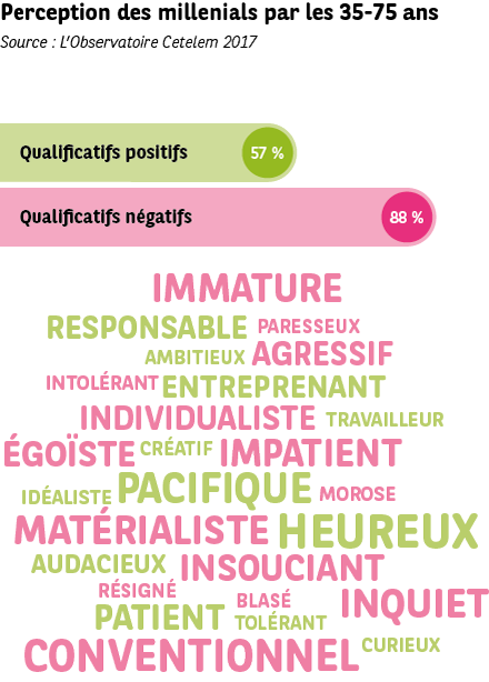 Il ressort en effet de cette étude que les + de 35 ans portent un regard très sévère sur les Millennials, mettant en exergue le traditionnel fossé générationnel souvent évoqué. Matérialistes (40 %), individualistes (31 %), paresseux (28 %), impatients (29 %), immatures (31 %)… les qualificatifs négatifs abondent, dressant le portrait d’une génération indifférente à la société, repliée sur elle-même, narcissique, dont la pratique du selfie pourrait