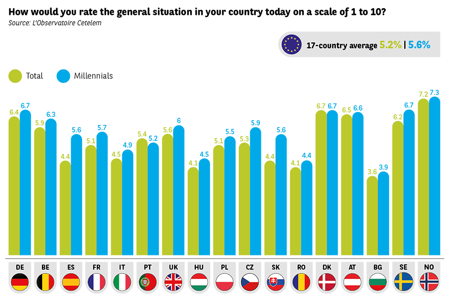 Les 18-35 ans jugent la situation de leur pays meilleure que leurs aînés (5,6 vs 5,2). Ce point de vue est partagé dans tous les pays, hormis au Portugal où les Millennials accordent une note inférieure à la moyenne nationale. À l’inverse, les nouvelles générations françaises et tchèques s’accordent à trouver leur pays en nettement meilleure santé que l’ensemble de leurs concitoyens (5,7 vs 5,1 et 5,9 vs 5,3).
