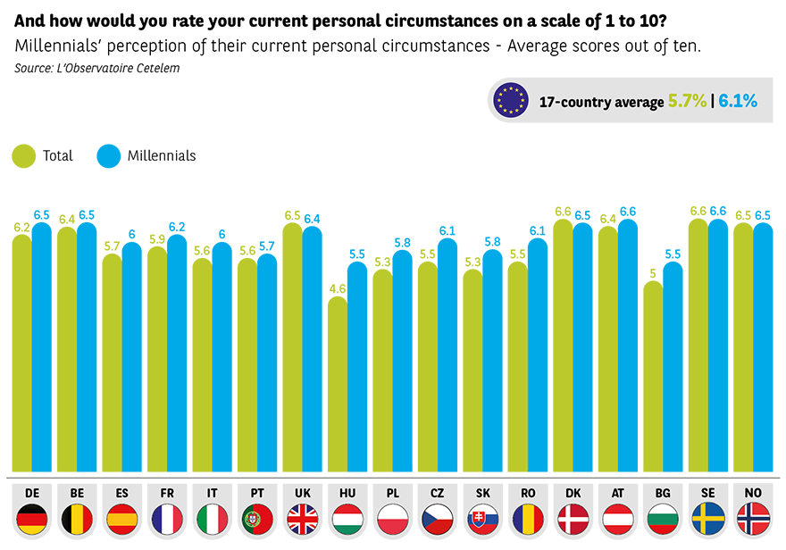 Au plan personnel, les Millennials sont tout autant portés à l’optimisme. Alors que les + de 35 ans accordent une note de 5,7, eux affichent un très confiant 6,1. Les différences intergénérationnelles peuvent même parfois être très sensibles comme en Hongrie et dans une moindre mesure en République tchèque, en Bulgarie et en Pologne. Les Millennials français se montrent aussi plus positifs que leurs aînés (6,2).