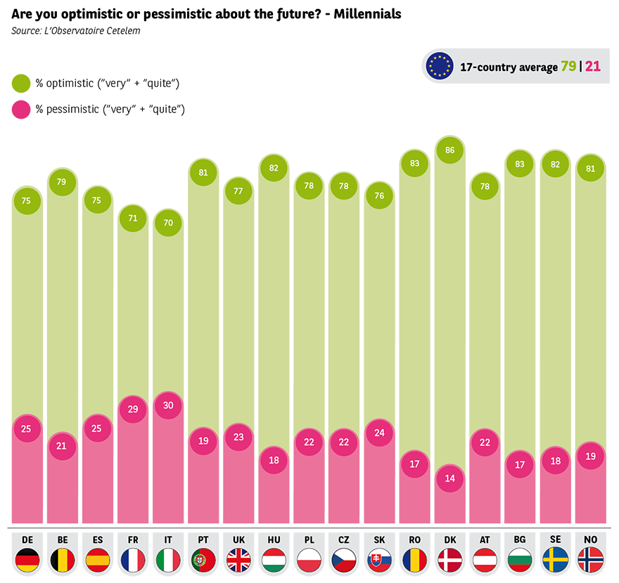 Lorsqu’ils envisagent le futur, les Millennials restent sur cette tendance positive. 8 sur 10 se déclarent plutôt ou très optimistes. Sur cette question, Français et Italiens se distinguent des autres Européens en affichant une légère inquiétude (29 % et 30 % de pessimistes).
