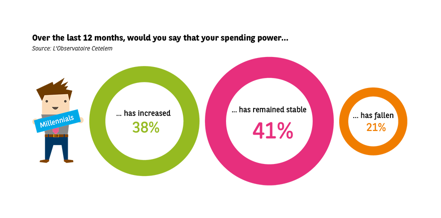La singularité des Millennials devient particulièrement marquée lorsqu’on les interroge sur la question du pouvoir d’achat. Alors que seulement un quart des Européens estimait qu’il avait augmenté, 38 % des Millennials pensent que c’est le cas. Et seulement 21 % constatent une baisse