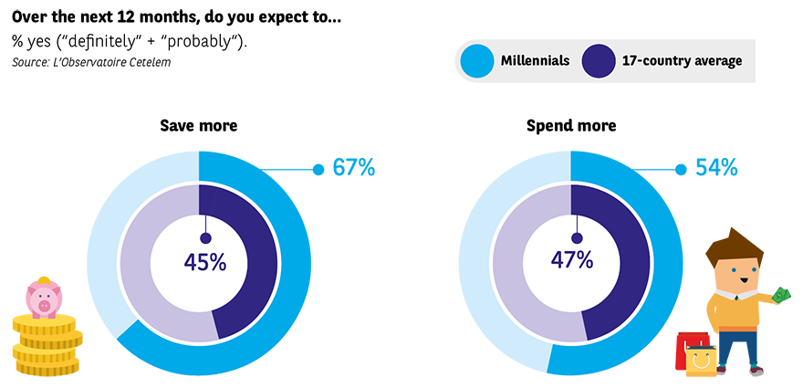 Pas étonnant que 54 % envisagent d’accroître leurs dépenses dans les 12 prochains mois (vs 47 % pour la moyenne des Européens). Plus surprenant, 67 % déclarent aussi vouloir épargner davantage (vs 45 % en moyenne européenne). Les Millennials ne seraient-ils donc pas cette génération insouciante que l’on s’imagine et que l’on s’accorde souvent à décrire ?