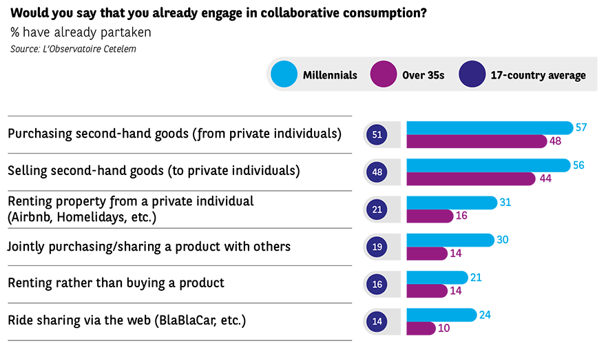 L’achat d’objets d’occasion est la pratique la plus répandue, 57 % des Millennials y ont déjà eu recours. Le développement de la colocation dans les grandes villes européennes, face à la flambée de l’immobilier, semble expliquer ce choix. La vente d’objets d’occasion figure également en bonne place (56 %). Notons aussi qu’1 Millennial européen sur 4 pratique le covoiturage contre seulement 1 + de 35 ans sur 10.