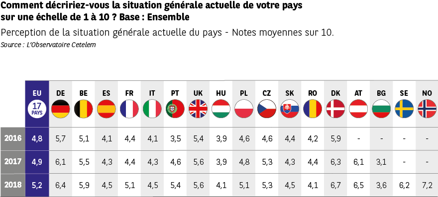 La France connaît aussi l’une des plus belles progressions (+0,7). La note est désormais au-dessus de la moyenne (5,1). Faut-il voir dans ce résultat un « effet Macron » avec l’émergence d’un discours positif contagieux ? Sans doute pour partie, avec là encore des données économiques qui s’améliorent quasiment dans tous les domaines et qui incitent à retrouver le sourire.