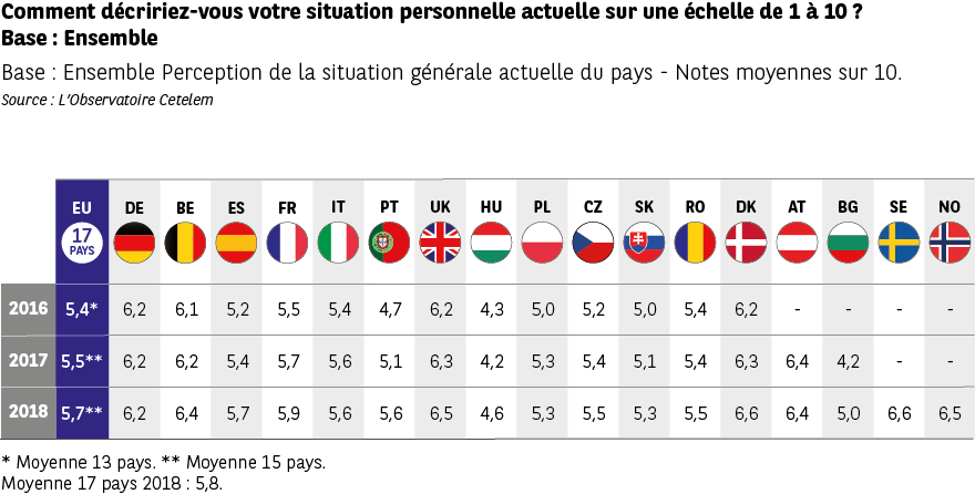 Pour la première fois depuis de longues années, la note moyenne attribuée par les Européens à la situation de leur pays est supérieure à la note moyenne de 5 (5,3). Pour rappel, celle-ci s’élevait à 4,9 en 2007 et à seulement 3,7 à son plus bas en 2013. Si une évolution positive était sensible depuis les quatre dernières éditions de L’Observatoire Cetelem de la Consommation, ce résultat marque cependant une embellie notable d’autant plus qu’elle concerne presque tous les pays de l’étude.