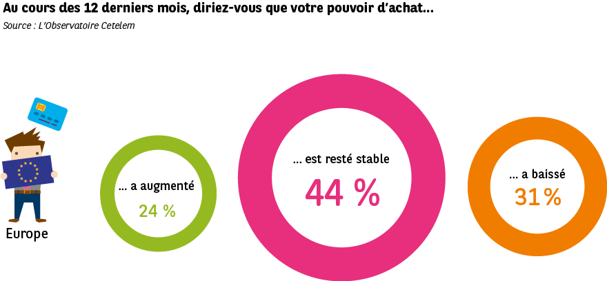 Cet allant se nourrit de considérations matérielles jugées favorables. 7 Européens sur 10 estiment que leur pouvoir d’achat est resté stable ou a augmenté, avec même une hausse de 6 points quand les consommateurs constatent une augmentation (+24 %). C’est en Suède, en Roumanie et en Norvège que les opinions sont les plus favorables à ce sujet (38 %, 37 % et 35 %). En revanche près de 1 Français sur 2 persiste à refuser l’évidence en estimant que son pouvoir d’achat a baissé.