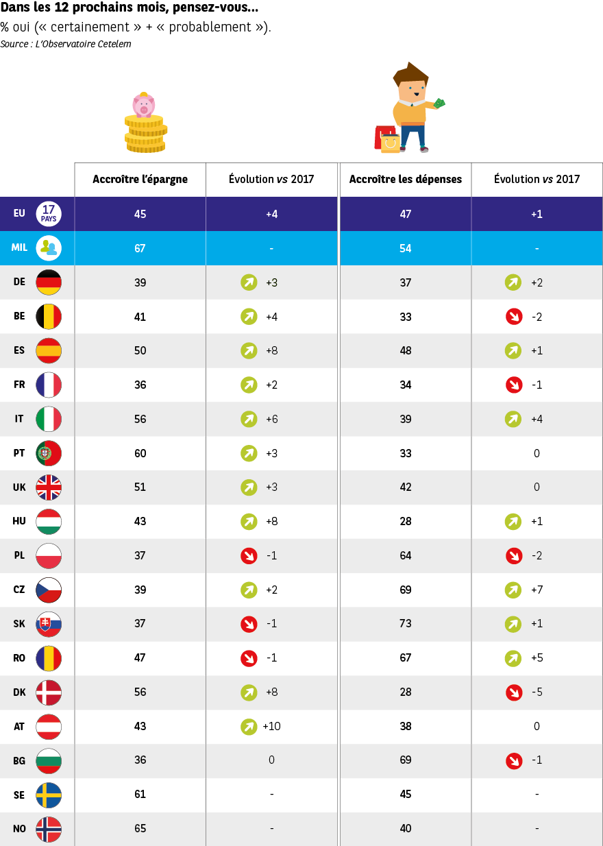 Cette bonne santé économique personnelle se prolonge par des intentions de consommer et d’épargner à la hausse. Deux indicateurs de L’Observatoire Cetelem de la Consommation qui ont toujours été confirmés dans la réalité. 47 % des Européens (+1 point) entendent consommer davantage dans les 12 mois à venir. Comme les années précédentes, c’est vers l’Est qu’il faut se tourner pour rencontrer les plus fortes envies de consommer (Slovaques 73 %, Bulgares et Tchèques 69 %, Roumains 67 %). À l’inverse, Danois, Portugais et Belges font preuve d’une certaine frilosité (28 % et 33 %) tandis que les Français ne se montrent guère plus enclins à la dépense (34 %).