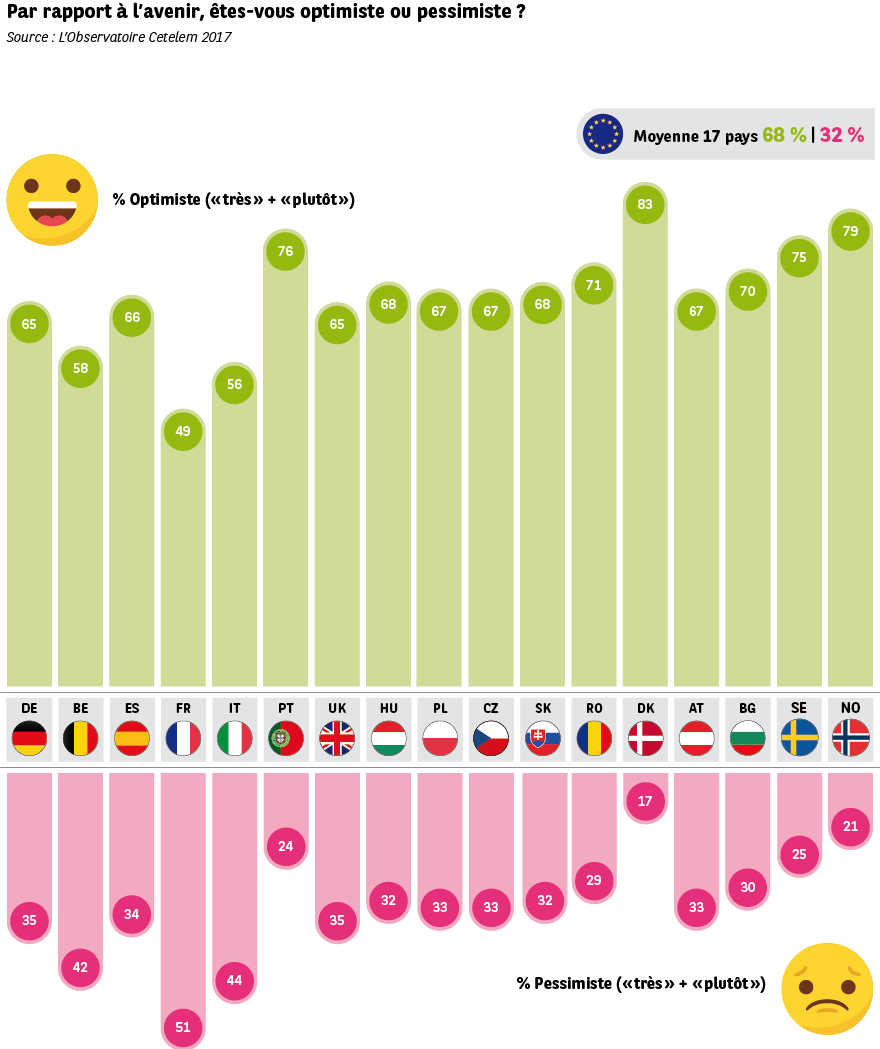 Quand on les interroge sur leur vision de l’avenir, les Européens gardent le sourire. 7 sur 10 se déclarent optimistes, voire très optimistes, en ce qui concerne l’avenir. Danois, Norvégiens et Portugais, décidément revigorés, ont foi en des lendemains qui continueront de chanter (respectivement 79 %, 75 % et 76 %). Une fois encore, les Français se distinguent en projetant un futur relativement atone. Ils sont les seuls à être majoritairement pessimistes