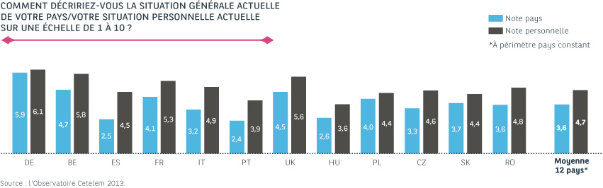Les consommateurs estiment que leur situation personnelle est meilleure que celle de leur pays : 3,6/10 en moyenne dans toute l’Europe pour la situation générale et 4,7/10 pour la situation individuelle. Cet écart est le signe que les consommateurs européens ont appris à composer avec l’atonie économique et qu’ils s’en accommodent tant bien que mal. Ils ont développé au final une aptitude à faire front à la crise, estimant parvenir à tirer leur épingle du jeu.