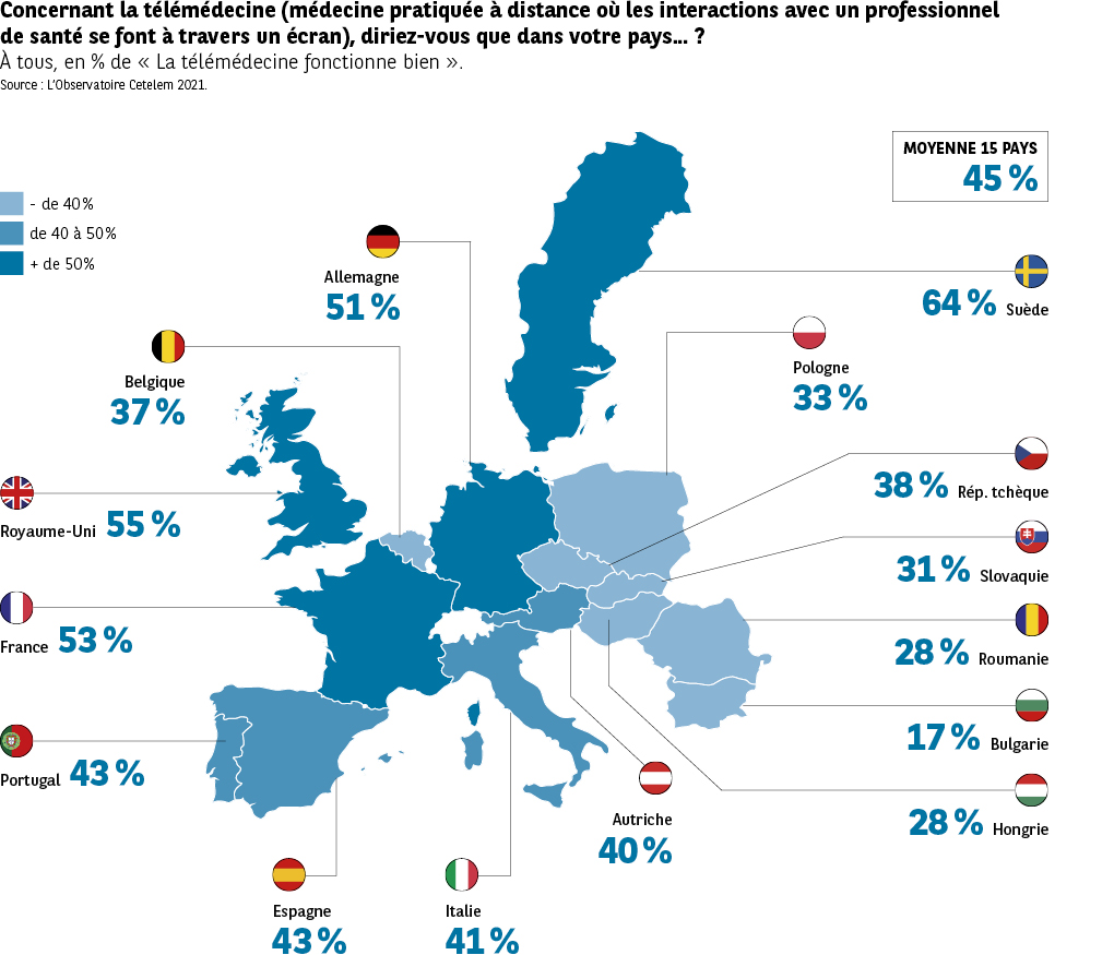 Comme au sujet de l’éducation à distance, le point de vue des Européens sur la télémédecine est plus que modéré. 45 % estiment qu’elle fonctionne bien (Fig. 46). La fracture est nette entre les pays du groupe Nord, ainsi que la France, qui la juge avec bienveillance, et les pays d’Europe centrale qui sont beaucoup plus critiques. La Bulgarie affiche ainsi seulement 17 % d’opinions positives. Il faut sans doute voir dans ces résultats le différentiel entre des pays très bien équipés au plan médical et d’autres qui le sont moins.