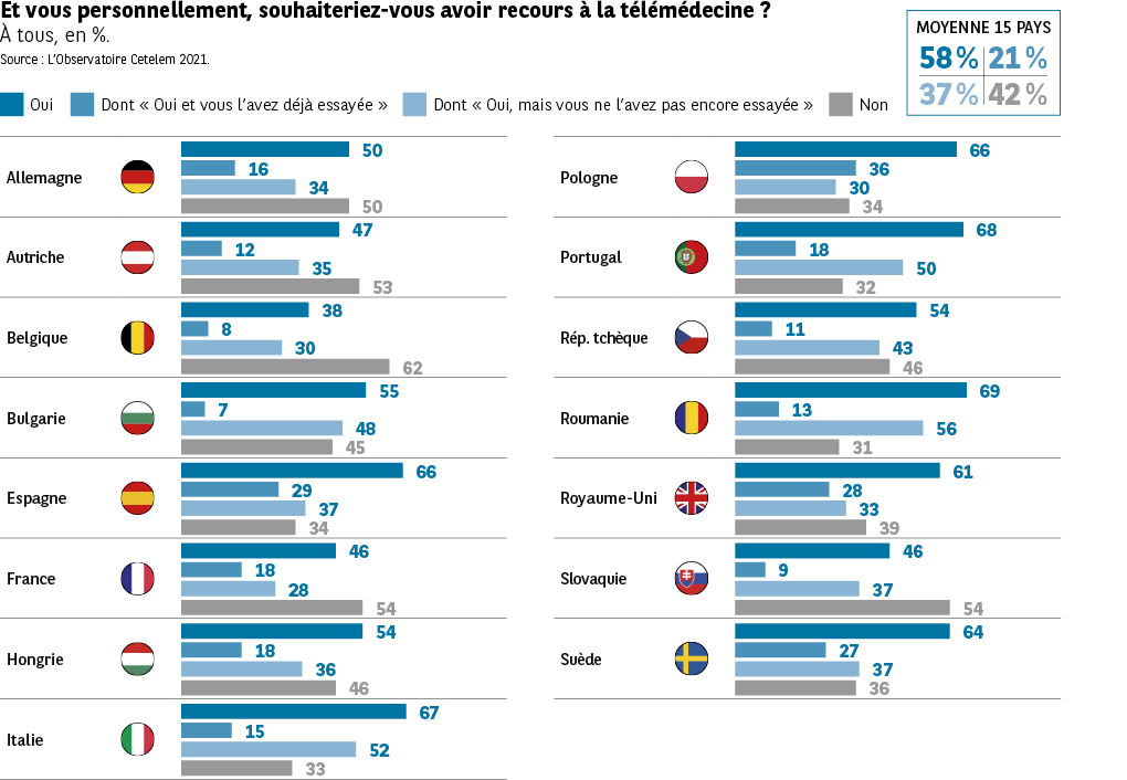Pour autant, près de 6 Européens sur 10 disent avoir déjà essayé la télémédecine ou être tentés de le faire (Fig. 47). C’est en Roumanie, au Portugal, en Italie, en Pologne et en Espagne que ses adeptes sont les plus nombreux. Les Belges, les Français, les Slovaques et les Autrichiens sont les plus réticents à franchir le pas (62 %, 54 %, 54 % et 53 %).