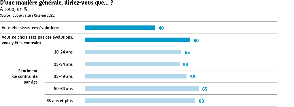 Sur cette question, les critères de l’âge et du niveau de revenus font apparaître un ressenti différent de cette contrainte. Les jeunes et les foyers aux revenus supérieurs l’acceptent plus facilement (45 % pour les 18-24 ans, 46 % pour les 25-34 ans) à l’opposé des séniors et des foyers aux revenus modestes (65 % pour les 50-64 ans, 63 % pour les 65 et plus).
