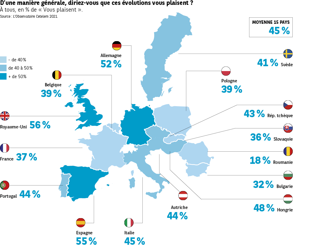 Évolutions subies, donc, mais aussi évolutions jugées plutôt défavorablement puisqu’elles plaisent seulement à 45 % des Européens. Une fois encore le Royaume-Uni et l’Allemagne, au tropisme sans contact affirmé, sont les plus séduits (56 % et 52 %) (Fig. 21). Avec des Espagnols qui sont aussi nombreux à aller dans leur sens (55 %). Et la logique géographique que nous avons relevée est globalement respectée. Les Roumains et les Bulgares goûtent très modérément à ces évolutions (18 % et 32 %). La France est à nouveau proche de ces derniers pays (37 %).
