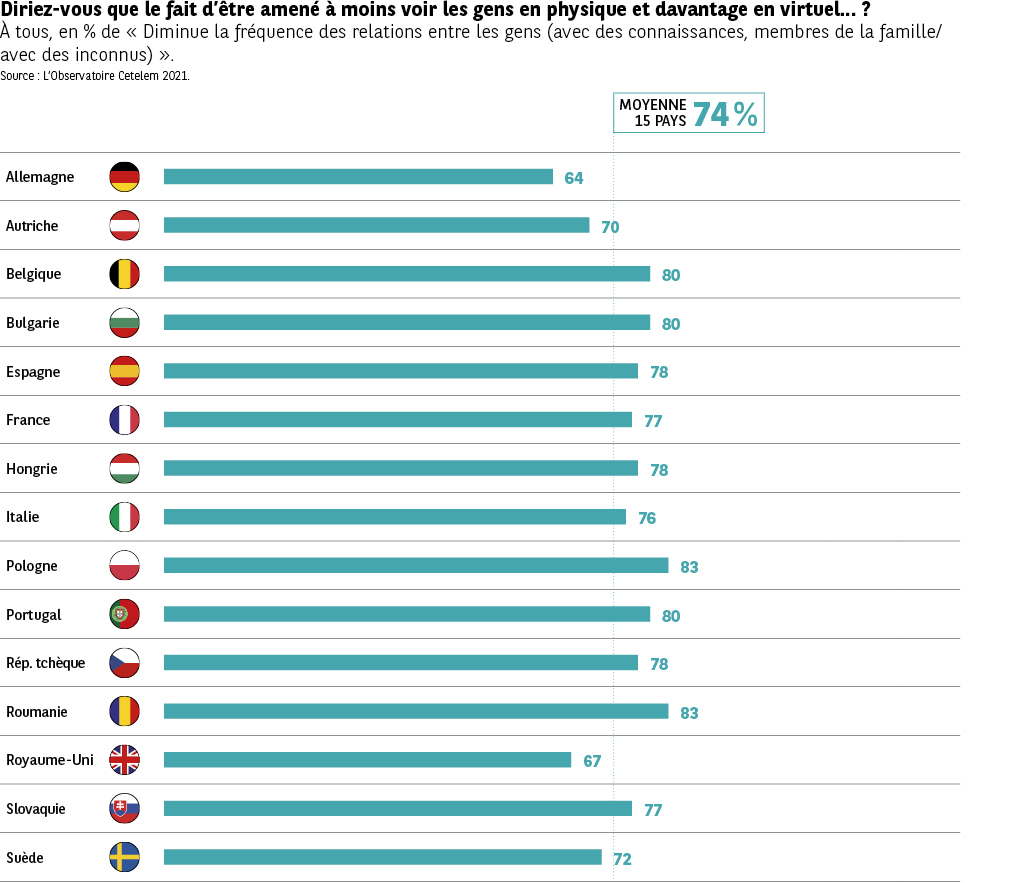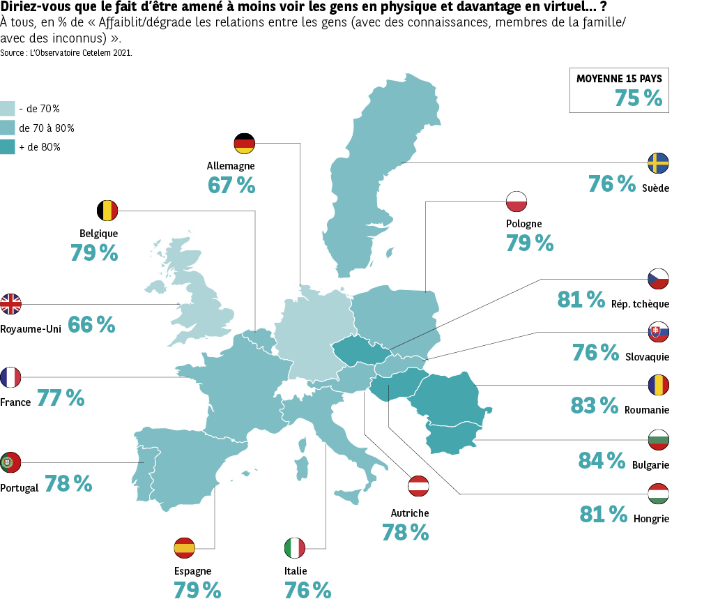 Les témoignages des Européens montrent qu’ils louent la praticité de la vie sans contact, particulièrement au quotidien. Ils font également émerger de façon latente de sérieuses réserves quant à la qualité des relations humaines qu’elle engendre. Et lorsqu’on interroge plus précisément ces mêmes Européens pour savoir si la vie sans contact physique avec les gens affaiblit, voire dégrade les relations humaines, la réponse est claire et nette. Trois quarts d’entre eux l’affirment (Fig. 30). Une fois encore, la plupart des pays du groupe Nord, à la maturité virtuelle plus affirmée, se montrent moins tranchants à ce sujet, particulièrement les Britanniques et les Allemands (66 % et 67 %). Et comme souvent, il faut gagner les pays d’Europe centrale pour trouver des opinions opposées. Bulgares, Roumains, Tchèques et Hongrois sont les plus nombreux à regretter cette mise à distance relationnelle (84 %, 83 %, 81 % et 81 %). Entre les deux, les pays latins affichent des opinions plus proches de la moyenne européenne.