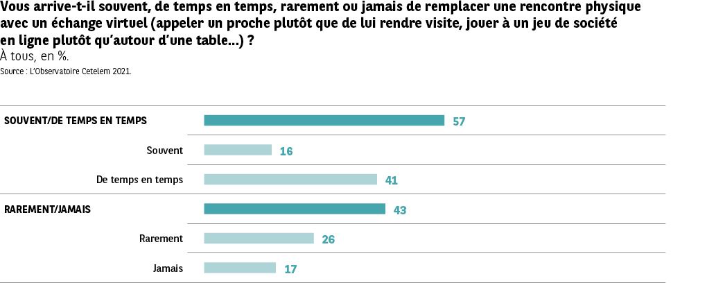 Cette prééminence du virtuel par rapport au réel ne se fait pas cependant à l’insu des Européens. Elle correspond même à un choix délibéré pour un peu plus de la moitié d’entre eux. 57 % déclarent en effet remplacer une rencontre physique par un échange à distance, que ce soit par exemple pour discuter ou jouer en ligne (Fig. 32). À ce sujet, tous les pays, excepté l’Autriche et la Hongrie, affichent des scores supérieurs à 50 %. Mais cette fois, pas de répartition en groupes géographiques. Ainsi, Suède, Pologne et Espagne sont les plus nombreux à favoriser le virtuel (64 %), soit un pays par groupe.