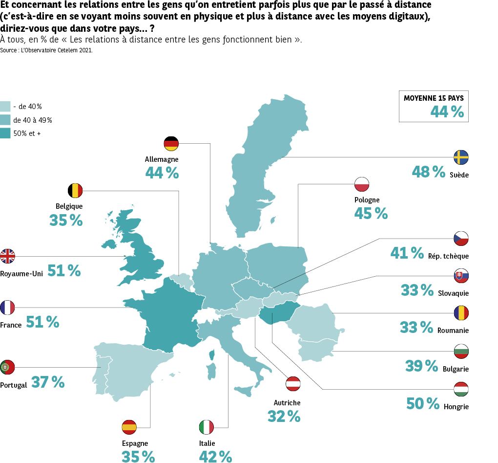 Les Européens expriment le sentiment diffus que cette vie relationnelle sans contact n’est pas la panacée. Seulement 44 % déclarent que les relations humaines de ce type fonctionnent bien. Français et Britanniques sont les plus nombreux à le penser (51 %) (Fig. 33). De façon générale, c’est au nord qu’elles sont le moins mises en cause, comme en Suède (48 %), alors qu’au sud les points de vue sur des relations sans contact physique sont jugés plus négativement, particulièrement en Espagne et au Portugal (35 % et 37 %). Autre pays aux racines culturelles latines, la Roumanie se montre encore plus critique (33 %).
