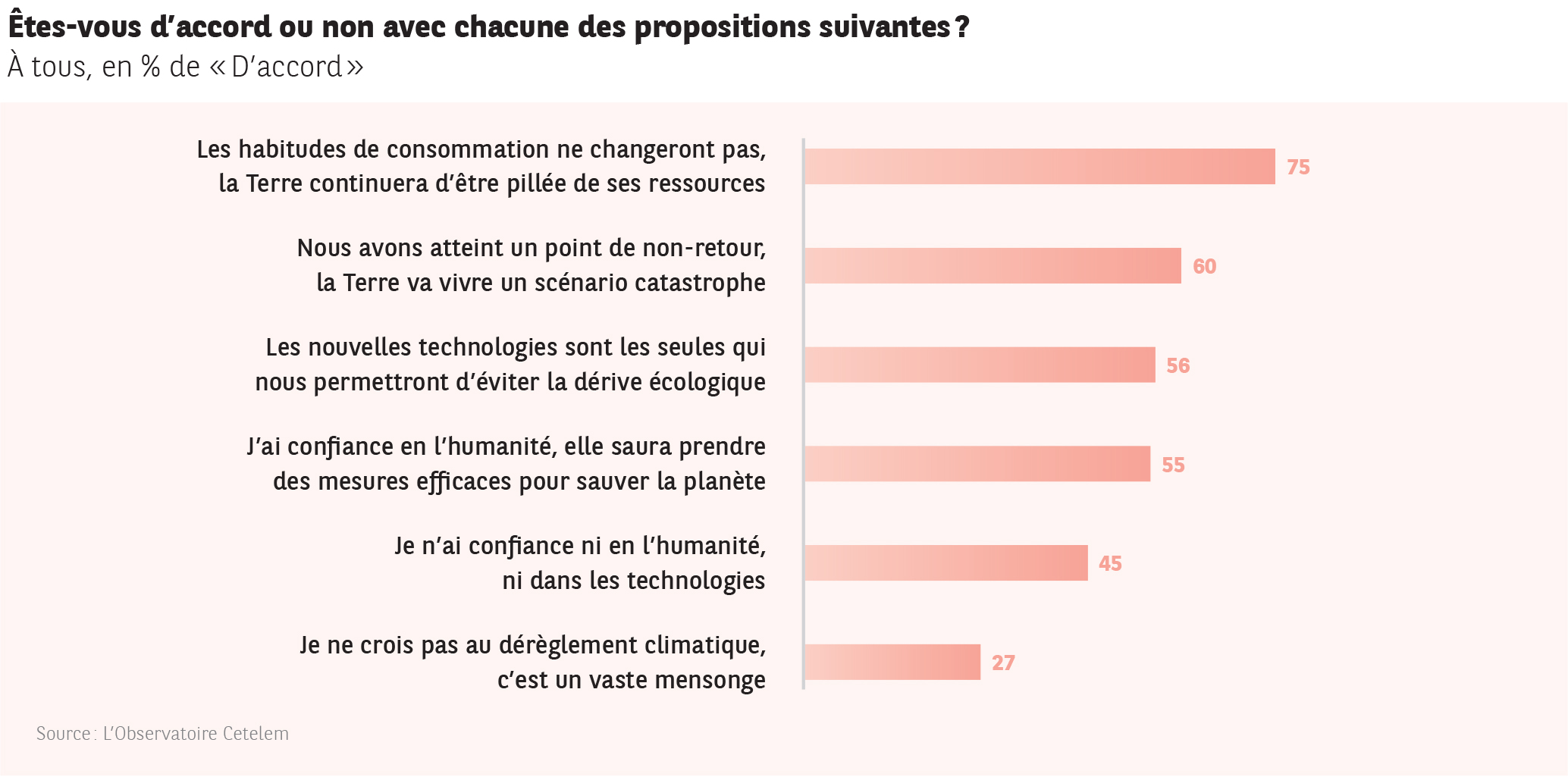 Tout serait-il donc perdu ? Pas tout à fait. Deux lueurs d’espoir brillent dans cette nuit d’opinions négatives. La technologie, qui pour 56 % des Européens peut venir contrecarrer la dérive écologique. La confiance, malgré tout, en l’humanité qui saura prendre les mesures nécessaires pour sauver la planète (55 %).