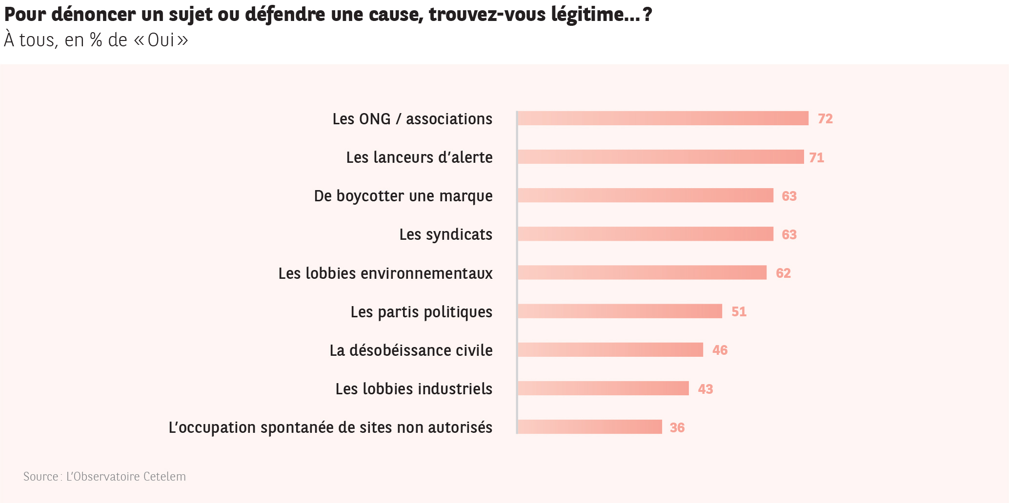 S’ils sont membres d’une ONG ou lanceurs d’alerte, les Européens les estiment clairement légitimes pour défendre une cause ou dénoncer un problème (72 % et 71 %).