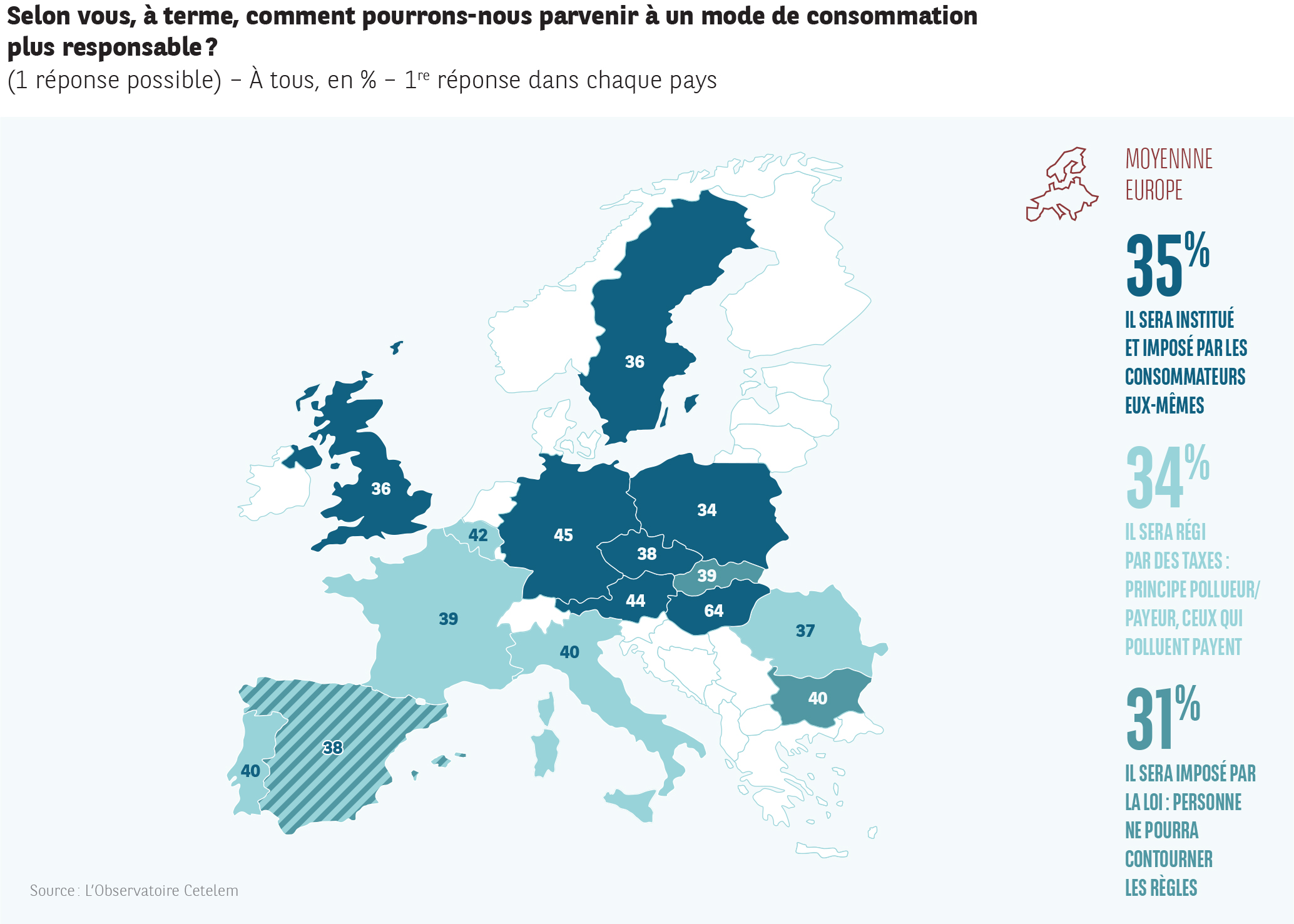 Pour 35 % des Européens, une consommation plus responsable sera imposée par les consommateurs eux-mêmes (Fig. 20). Une « solution » plus populaire que des taxes type pollueur-payeur ou des lois contraignantes (34 % et 31 %). Les pays du Nord constituent les terres d’accueil privilégiées de ces nouveaux consommateurs qui influencent l’avenir de la consommation. Aucune différence générationnelle n’apparaît sur cet engagement.
