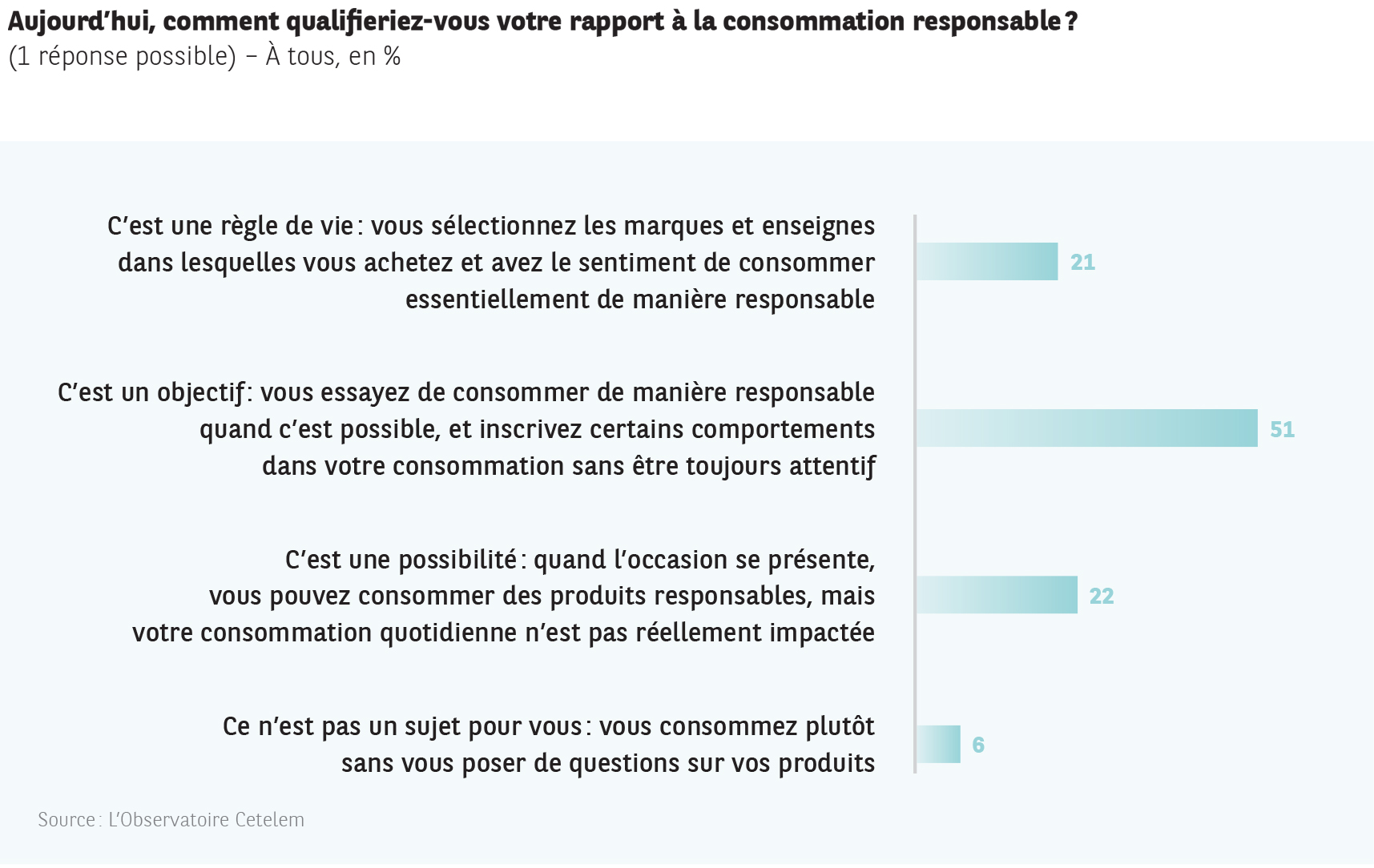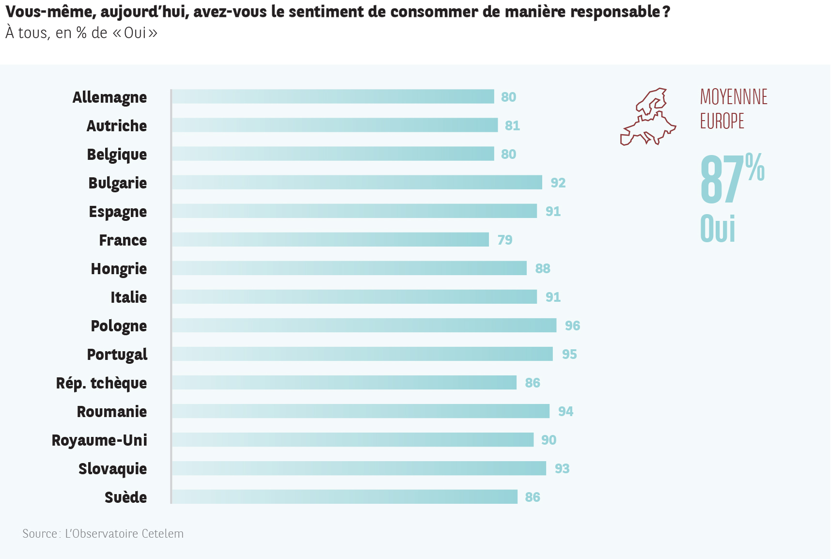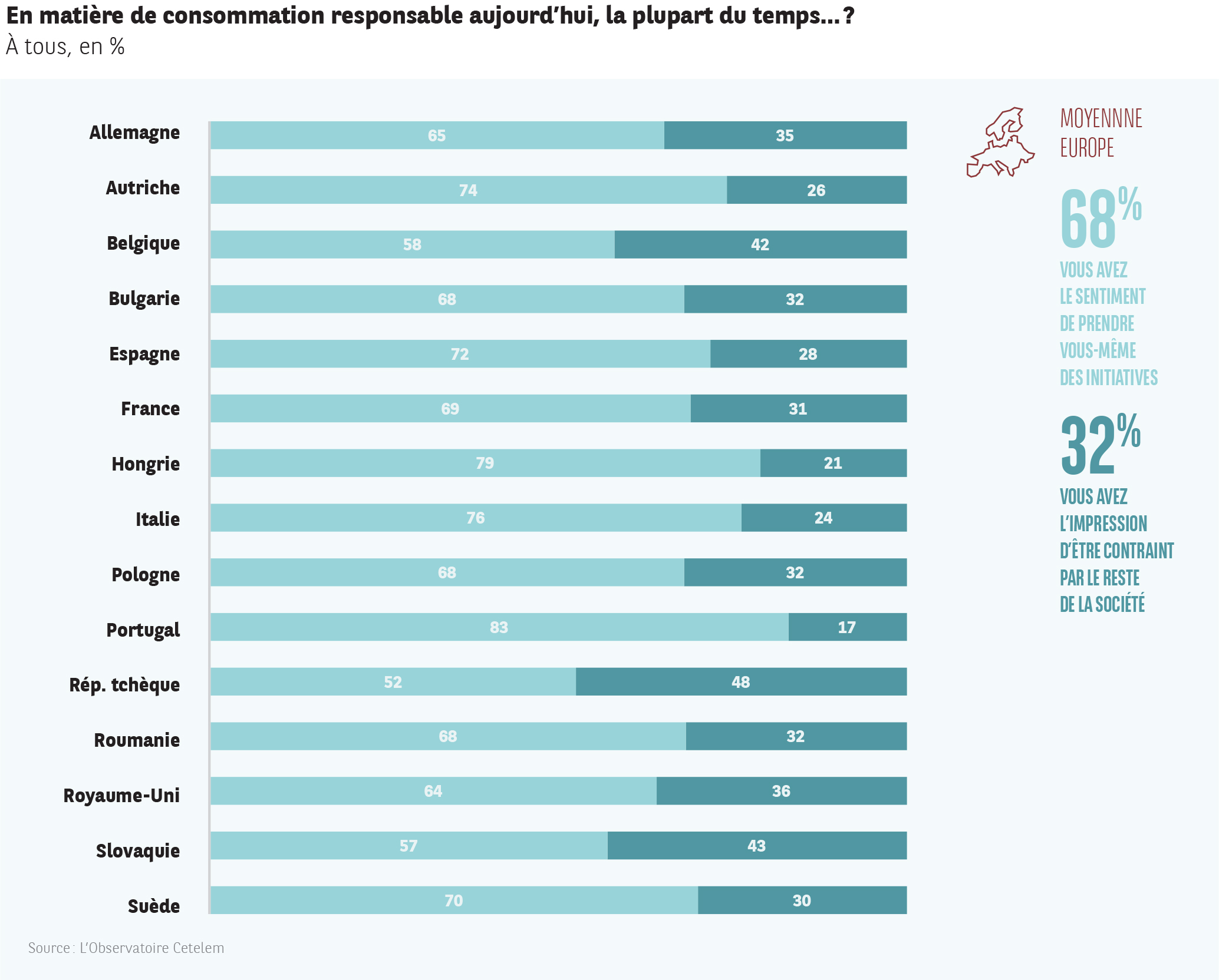 Cependant, d’un pays à l’autre cet engagement individuel est plus ou moins marqué. Alors que 83 % des Portugais ont le sentiment de prendre des mesures concrètes pour une consommation plus responsable, seulement 52 % des Tchèques partagent ce point de vue.