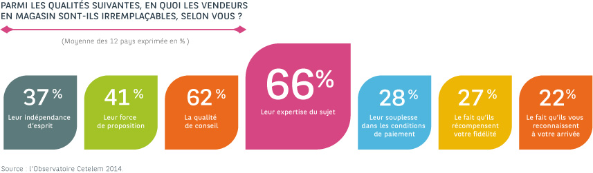 Deux tiers des Européens considèrent que « leur expertise du sujet » est la qualité numéro un qui rend les vendeurs en magasin irremplaçables. Suivie immédiatement par la « qualité de conseil », leur force de proposition et leur « indépendance d’esprit ».