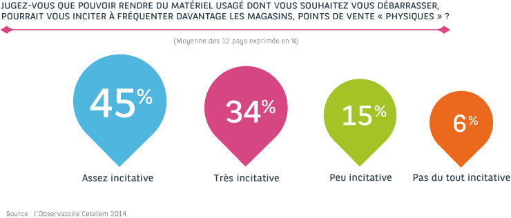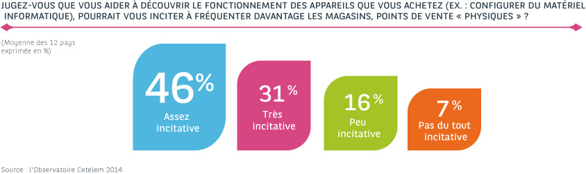 Les consommateurs viennent essentiellement chercher en magasin une expérience du produit qu’ils ne peuvent vivre au travers d’Internet : pouvoir le voir, le tester et le prendre en main, avant d’arrêter leur décision d’achat. Ainsi, plus des trois quarts des Européens estiment que les « aider à découvrir le fonctionnement des appareils qu’ils viennent acheter » les inciterait à fréquenter davantage les points de vente physiques.