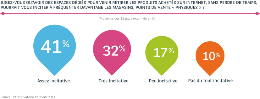 Un nouveau service a vu le jour et permet de faire sa sélection d’articles en amont, sur Internet, avant d’aller récupérer ses produits en magasin : c’est le Click & Collect, pont entre le online et le offline. De nombreux magasins proposent déjà ce service, notamment dans la grande distribution (Drives). Un gain de temps important, considéré par les trois quarts des Européens comme une bonne solution pour attirer les consommateurs dans les magasins.