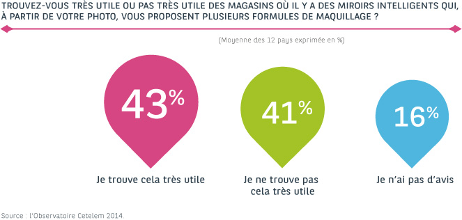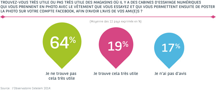 Alors, de là à attendre des magasins des cabines d’essayage numériques connectées à Facebook pour poster en direct des photos, il y a un pas que les Européens ne sont pas prêts de franchir. Pas d’urgence donc du côté des magasins pour s’équiper avec ce mobilier connecté. Les chiffres parlent d’eux-mêmes : moins de 20 % des Européens y voient un intérêt, chiffre bien faible quand près de deux tiers d’entre eux jugent en revanche cela inutile.