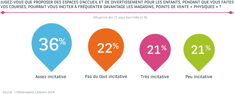 Autre service plébiscité par les Européens, « proposer des espaces d’accueil et de divertissement pour les enfants » : en moyenne, 57 % des consommateurs des douze pays estiment qu’une telle offre les inciterait à fréquenter davantage les zones commerciales.