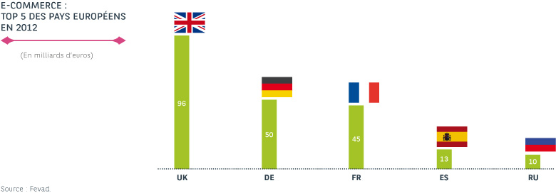 En France et en Allemagne, le e-commerce pèse respectivement 45 et 50 milliards d’euros en 2012. Cela représente, en France, 7 % du commerce de détail hors alimentaire, selon la Fevad, et l’on compte près de 32 et 37 millions d’e-consommateurs français et allemands, soit 48 % de la population pour chacun des deux pays.