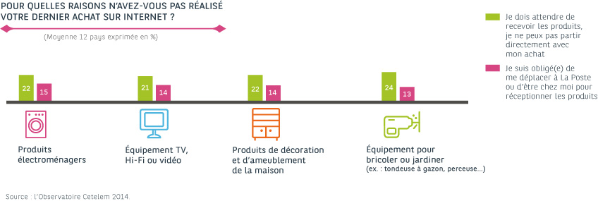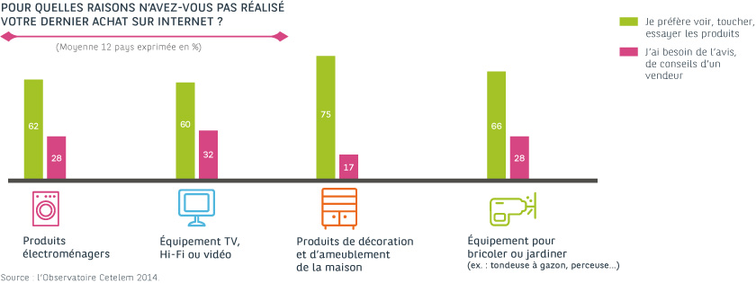 De plus, à une écrasante majorité, les Européens émettent le souhait de voir, de toucher et d’essayer les produits avant de les acheter ; ceci représente le principal frein lors d’un achat en ligne, et un véritable avantage concurrentiel des magasins sur le Web.