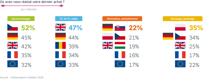 Même pour les marchés les plus concernés par l’achat sur Internet, tels les produits Hi-Fi ou l’électroménager, près de 70 % des Européens ont réalisé leur dernier achat directement en magasin.